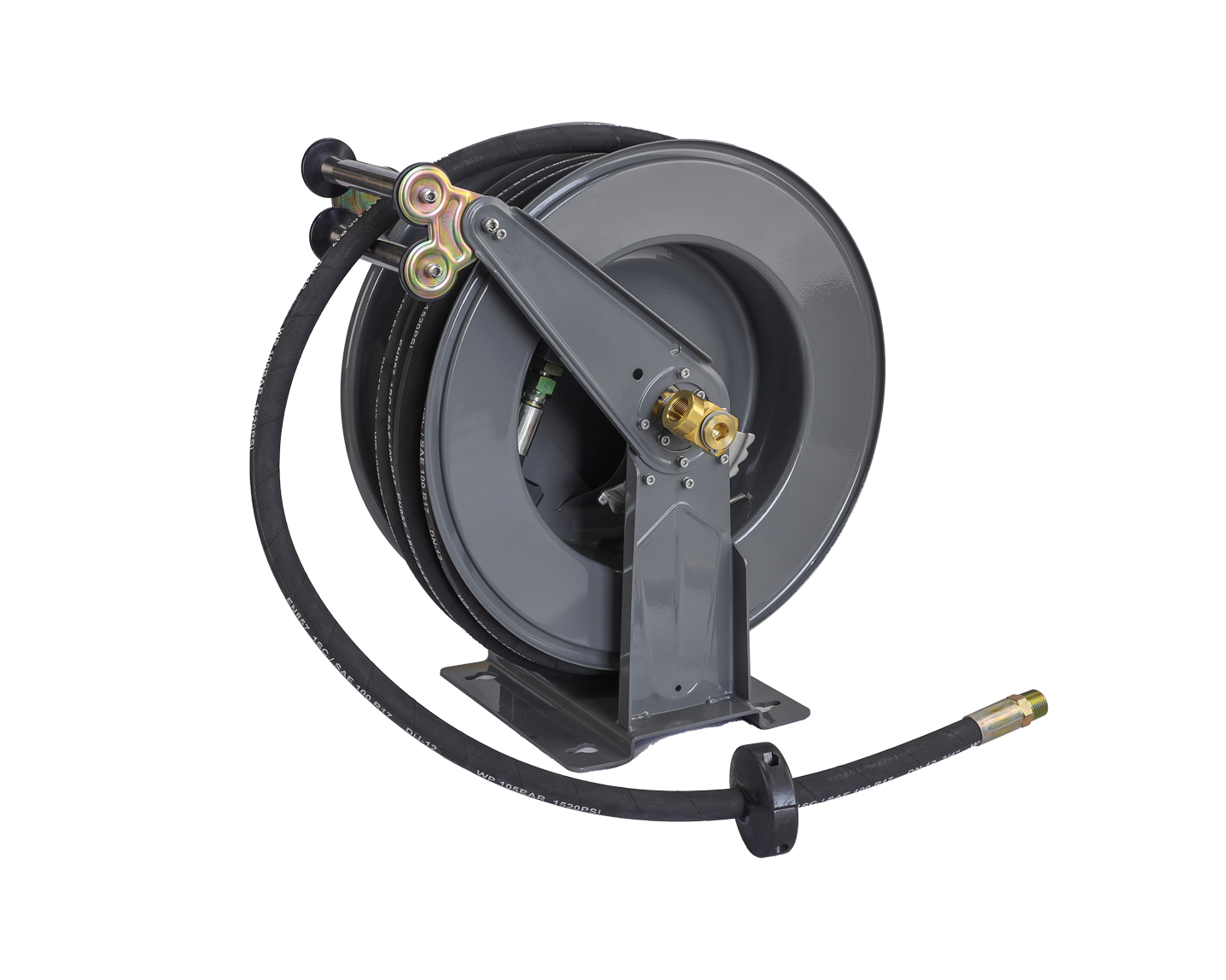 Spring rewind hose reel designed for low-pressure applications. Built with a heavy-duty steel frame and corrosion-resistant finish, these reels offer smooth hose retraction and long-term durability with minimal maintenance.